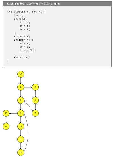 The proposed algorithm is first implemented on a particular case study, entitled as the Greatest Common Divisor (GCD), which produces the greatest common divisor of any two input numbers. The source code for GCD with two integers as input, namely m and n, is illustrated in Listing 1. Furthermore, the proposed algorithm is implemented on different SUTs, as listed in Table 1. Moreover, the Control Flow Graph of the GCD Function is illustrated in Figure 2.