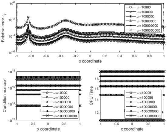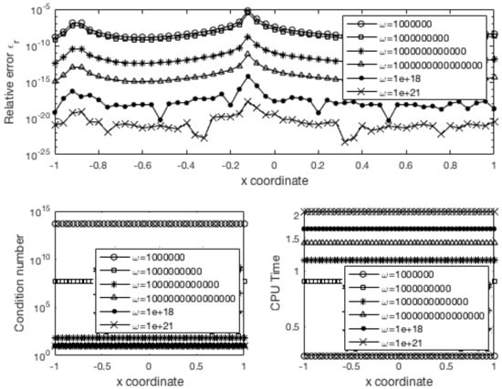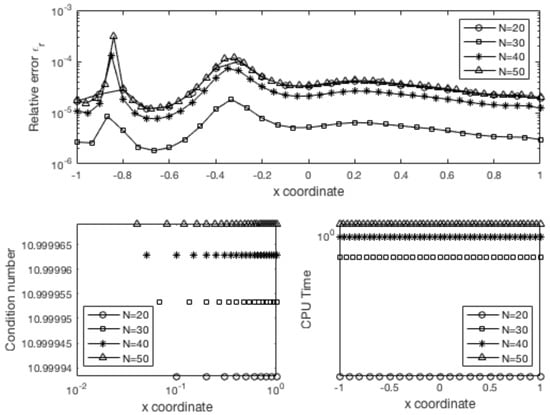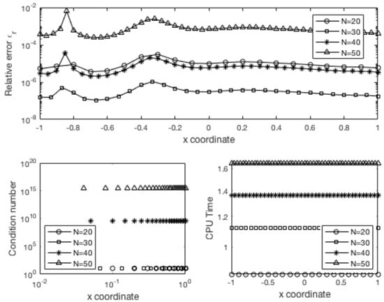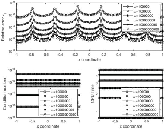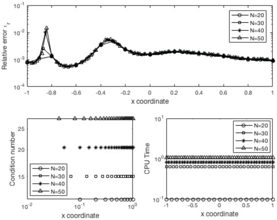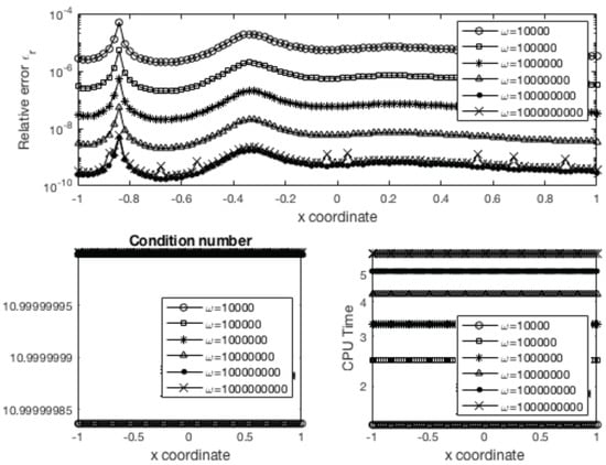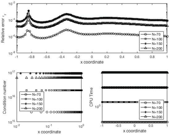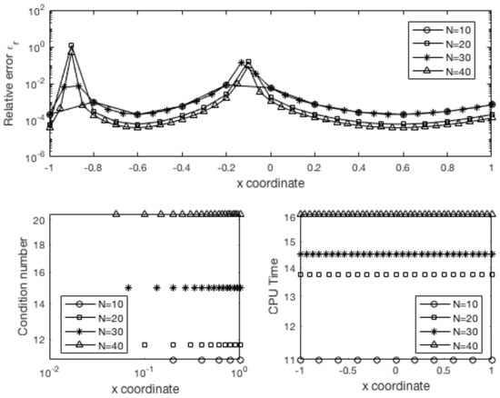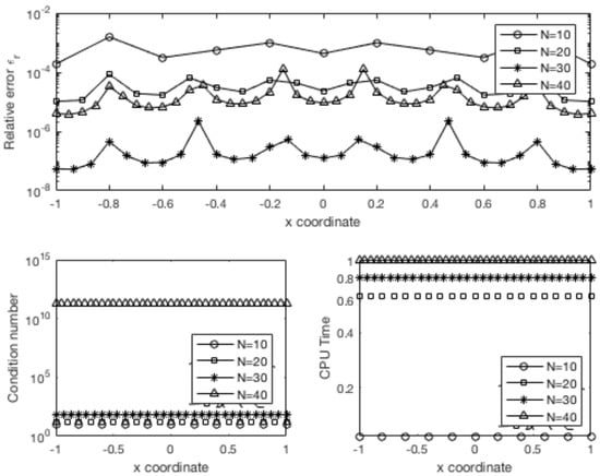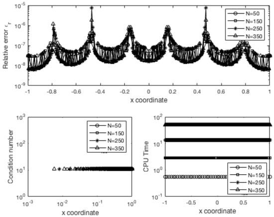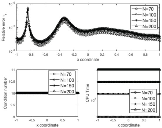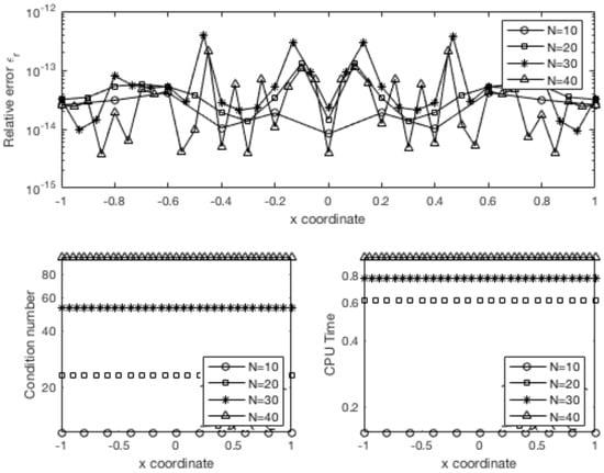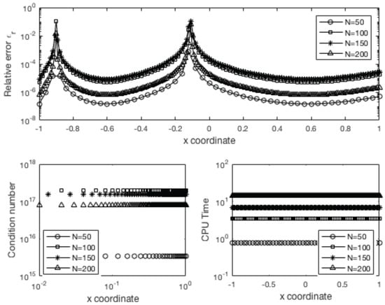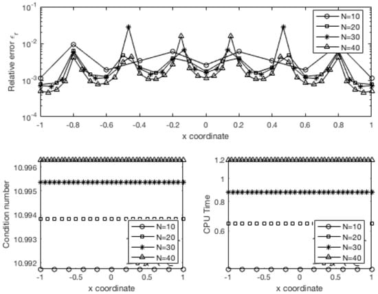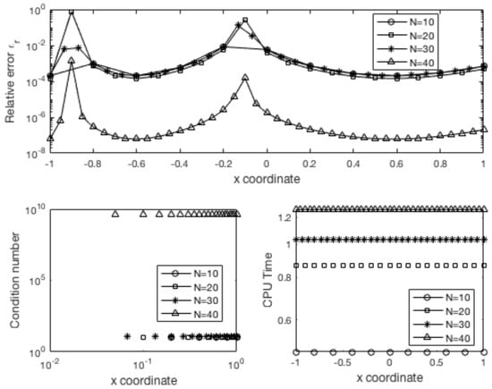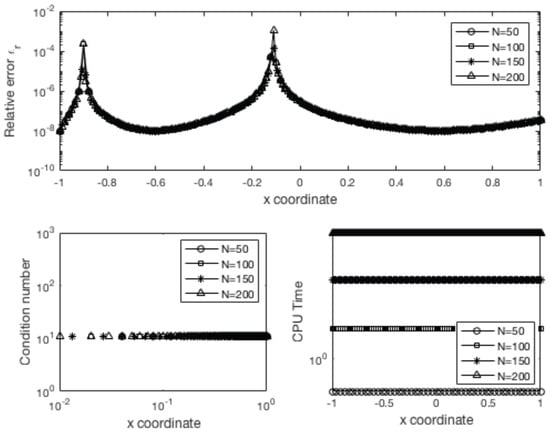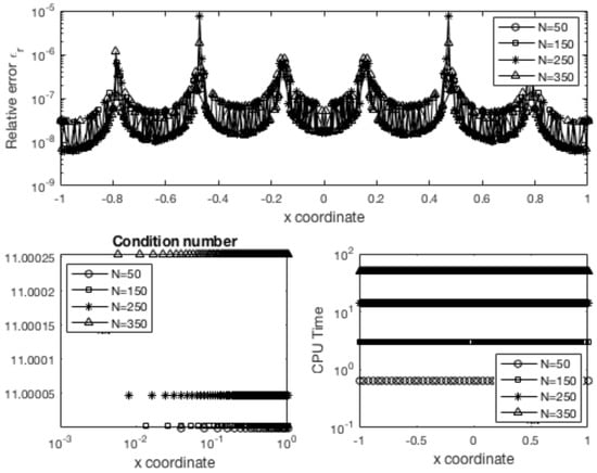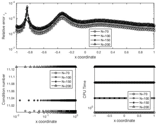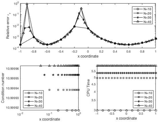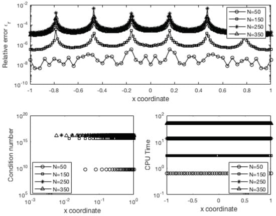This section presents the practical implementation of the proposed method on benchmark problems. In each case, the relative error , conditioned number, and CPU time have been reported and compared with the existing methods in the literature [,]. The method in [] is based on the MQ-RBF, which has a shape parameter, and the proper selection of a shape parameter is still an open problem. For simplicity, we have taken the shape parameter . On the other hand, the CS-RBFs also involved a scaling parameter, which affects the performance of the method. In this work, we have applied CS-RBF in the numerical experiments with scaling parameter . The details of the scaling parameter and its effects on accuracy and stability can be found in [,,].