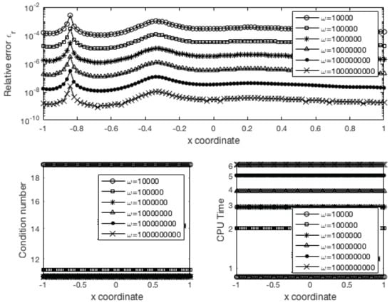 Relative error , condition number and computational time of the problem (29) with by the proposed method.