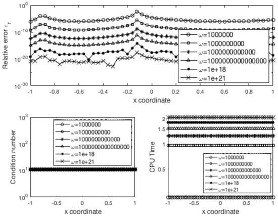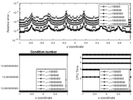 Relative error , condition number and computational time of the problem (27) with by the proposed method.