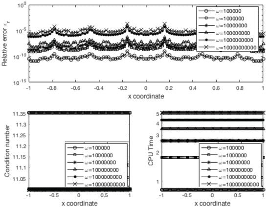 The exact solution of Equation (28) is . The FIEs (28) are evaluated by the methods in [,] and by the proposed method. For low nodal points and fixed frequency, the performance of the method [] is better in accuracy but worse in conditioned number and computational time (Figure 10, Figure 11 and Figure 12 reflects this behavior). As the nodal points increased, the proposed method gained its goal of better accuracy, well-conditioned behavior, and fast computation (Figure 13 and Figure 14 confirms this claim). The proposed method maintained its good performance for the large frequency and fixed nodal points as well (Figure 15 and Figure 16 verify this).