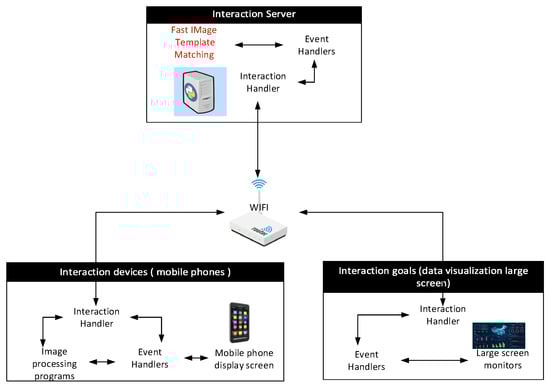 The interaction device grabs the information in the interaction target. It sends a response to it, and the interaction server coordinates the communication and information processing between the interaction device and the interaction target. Within the same LAN, each device in the interaction space is identified by a URI according to the WebSocket protocol transmission rules. The partial chart image in the large screen taken by the cell phone and the complete image of the large screen display are simultaneously transmitted to the interaction server for template matching, and the matching result information is returned to the interaction device and the interaction target, respectively. During the interaction process, the interaction handler is mainly responsible for the communication and data exchange between the cross-devices. The event handler is primarily responsible for responding to user interaction, tracking and parsing the changing screenshots, and responding to the server’s changes to the large screen display content. The image processing program is mainly responsible for processing the captured images, such as moiré removal and noise reduction. The image template fast matching primarily refers to the template matching between the large screen image and the image taken by the cell phone, and finally, the matching result is obtained. The server component is independent of the interaction target and the interaction device, so it has the advantage that it can be easily extended to multiple targets and multiple users.