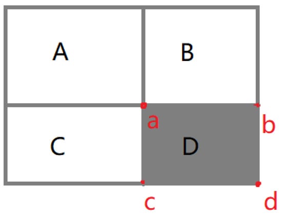 In order to avoid the problems of large computation and the long-running time of traditional algorithms, this paper chose to use the integral image as the decisive index factor to exclude mismatched regions in the coarse matching process. An integral image is a region in which the gray value of each pixel is equal to the sum of the gray values of all pixels before that pixel. The image in the candidate box was divided into four regions, labeled A, B, C, and D, and the pixels in the lower right corner of each region were labeled a, b, c, and d. The values of the four pixels in the integral image are sum(A), sum(A + B), sum(A + C), and sum(A + B + C + D), and the value of the integral image for region D is sum(A + B + C + D)“−” Usum(A + C)“−” Usum(A + B)“−” Usum(A), and the specific method is demonstrated in Figure 3 below. Since the square, octagonal K-value template box was composed of two squares superimposed at different angles, the square octagon was first completed into two squares with the same side length, and the integral images corresponding to the two square box regions were calculated separately. The gray value of the pixel point was the middle gray value of the gray set to which the pixel point belonged. The summation of the two regional integral images was taken as the mean value as the final measure for judging whether the regions match.