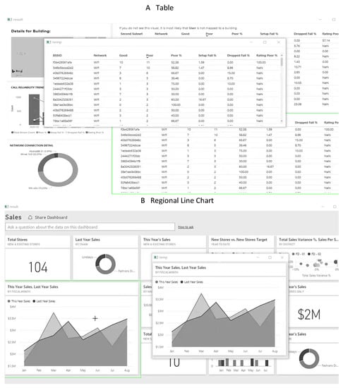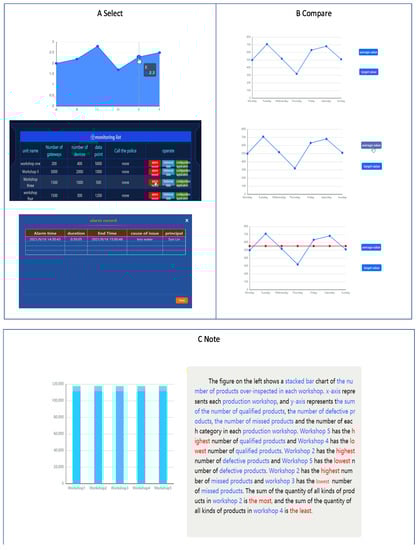 As shown in Group A, using the selection function of the interactive function, the mobile phone took a picture of a line graph of the profitability of each product. It then established a connection with the data visualization screen, in which the mobile phone viewed the specific values of the profitability of each product in detail. The business user can check whether the values were at the expected level. The mobile phone took a picture of a table of the monitoring list and then established a connection with the data visualization screen. Using the mobile phone, the button of the alarm record can be selected. The user can view the specific details of the alarm record by means of a pop-up link, then summarize the experience to reduce the number of alarms. As shown in Group B, the comparison function in the interactive function was used. After the mobile phone took a picture of the basic line graph of the total daily production of the workshop of the manufacturing enterprise and established the connection with the data visualization screen, the specific details of the basic line graph of the total daily production of the workshop were displayed on the mobile phone. The enterprise user could select the buttons of average value and target value to add representative data again. After comparing the data in the original graph, it is possible to find the deviation value and the problem in time to ensure the completion of the plan on schedule. As shown in Figure 6C, using the annotation function in the interactive function, the mobile phone took a picture of the stacked bar chart of the number of product inspections in each workshop. It then established a connection with the data visualization screen. The specific situation of the stacked bar chart of the number of product inspections in each workshop was displayed on the mobile phone. At the same time, the system generated a template based on natural language generation technology for the stacked bar chart of the number of product inspections in each workshop based on the acquired details of the stacked bar chart and detailed text.