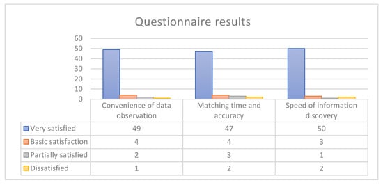 In order to evaluate the application effect of the method of establishing the interaction between the visualization screen and the mobile phone terminal through the positive octagonal K-value template matching in manufacturing enterprises for observing data, this paper randomly sent online questionnaires to the supervisors of each workshop, technicians of each workshop, data analysts, data visualization technicians, and controllers of the data visualization screen in manufacturing enterprises that use the data visualization screen for observing data, and received a total of 56 valid responses. The questionnaire was used to find whether the method of using K-value template matching to establish the interaction between the visualization screen and the mobile phone was helpful for data observation, whether the time required for matching and the accuracy of matching were satisfactory, and whether the time for discovering key information about the data was shortened to understand how the participants used the mobile phone and the visualization screen simultaneously for linked observation. The questionnaires were filled out according to the participant’s satisfaction with the method after use. After collecting the completed questionnaires from the participants, the results were tallied and presented in the form of bar graphs for analysis, as shown in Figure 7.