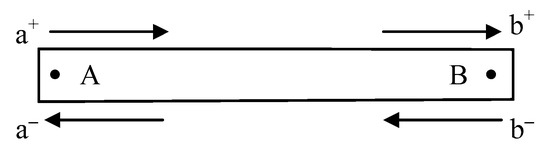 where and represent the forward propagating wave coefficients at points A and B, respectively. and are the backward propagating wave coefficients at points A and B, respectively: