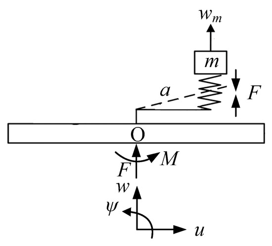 The resonator is the 2-DOF type because it applies force and moment to the host beam simultaneously, as depicted in Figure 4. In the figure, is the transverse deflections of the mass blocks . is the force caused by the spring. , , and are the transverse deflection, axial deflection, and angular rotation of the host beam at the point the resonator is attached. F and M are the force and moment of the resonator applied on the host beam, respectively. Note that the axial deflection u is not involved here because the 2-DOF force-moment-type resonator does not apply axial force to the host beam.