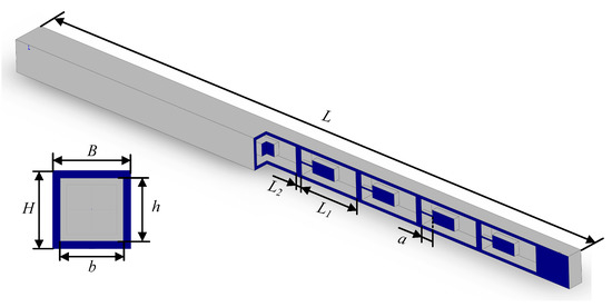 It is considered that the material of the designed LR beam, as shown in Figure 7, is resin as an example. Some relevant parameters are as follows: the Poisson’s ratio , the Young’s modulus , and the mass density . The shear coefficient is calculated by , and the shear modulus can be obtained from [32]. The width B and height H of the solid beam are both 25 mm, respectively. The inside width b and height h of the hollow beam are both 20 mm. The external excitation is applied at the position L11 = 8 mm from the left end of the host beam, and L12 = 22 mm. Meanwhile, the measured point is located at the point with a distance Lo = 8 mm from the right end of the host beam. The length from the end of the last hollow beam to the right end of the host beam is (point D) L = 30 mm.
