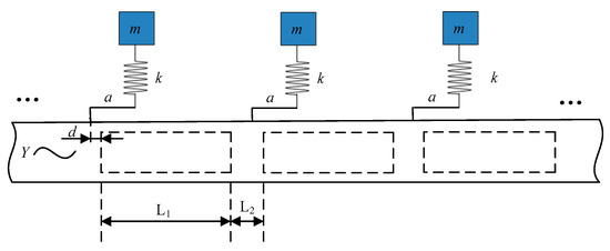 Figure 7 denotes the designed lightweight LR beam suspended periodically with eight 2-DOF force-moment-type resonators inside. The physical parameters are marked in the figure. In each cell, the length of the hollow beam is L1 and the length of the solid beam is L2. Based on the approach described above, the designed beam can be considered as shown in Figure 8. Note that the distance d between the point resonator attached and the point section changed is defined as a very small number to match the model in Figure 7.