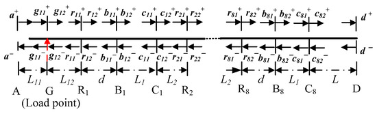 Figure 9 illustrates the vibration wave components in the LR beam. As shown in the figure, the force-moment resonators are attached at points R1, R2, R3, R4, R5, R6, R7, and R8. The section-change points are labeled as B1, B2, B3, B4, B5, B6, B7, and B8 (section changes from a solid beam to a hollow beam), and C1, C2, C3, C4, C5, C6, C7, and C8 (section changes from a hollow beam to a solid beam). The boundary condition of the LR beam is free. The external force is applied at point G, and the insert force generates waves , and . The distance between the point G and the left end of the host beam (point A) is , and the distance from point G to point R1 (the first resonator attached point) is . The length from the end of the last hollow beam to the right end of the host beam (point D) is . Based on the propagation, transmission, and reflection relations described in Section 2, the relations of waves at discontinuities of the LR beam can be obtained as follows.