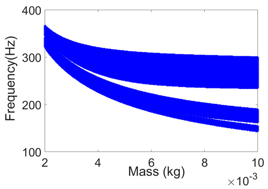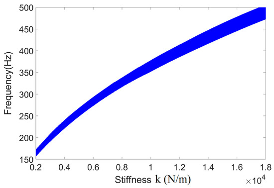In this example, we investigate the influence of five resonator parameters on the band gap properties of the LR beam alone. They are the resonator mass , spring stiffness , arm length , and the length of the solid and hollow beam and . The variation trend of the band gaps with a certain parameter is calculated by fixing the other four parameters. First, the influence of the resonator mass on the band gaps of the LR beam is investigated by varying from 2 to 10 g, and the other four parameters are fixed as:=, , , and . As shown in Figure 10, the width of the band gap gradually increases with the resonator mass and changes towards the lower frequency range. However, a pass band appears between the higher and lower-frequency band gaps, and the width of the pass band increases significantly with the resonator mass . To study the effect of the spring stiffness of the resonator on the width and frequency range of the band gaps of the LR beam, the band gaps corresponding to the variation of the spring stiffness from 2000 to 12,000 are calculated and are shown in Figure 11. The other four resonator parameters are: = , , , and . It can be seen from Figure 11 that the width of the band gaps increases slightly with the spring stiffness , and the band gaps move significantly to the higher frequency range.