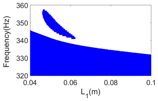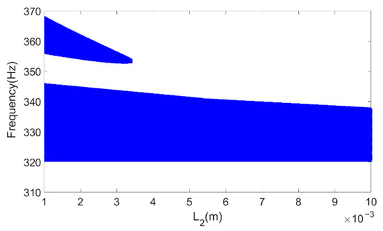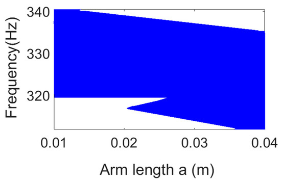 In addition, the influence of the three length parameters , , and of the resonator on the band gaps of the LR beam are also studied. Figure 12 shows the variation trend of the band gaps with the arm length , where the other four parameters are fixed as: = , = , , and . It can be seen from Figure 12 that the width of the band gap of the LR beam increases slightly with the arm length , and the frequency range remains nearly unchanged, thus illustrating the small effect of the arm length on the band gaps of the LR beam. Similarly, the separate effects of the other two length parameters and on the band gaps of the LR beam are shown in Figure 13 and Figure 14, respectively. The range of varies from to and varies from to . From Figure 13, we can see that the width of the band gap decreases with the increase in the length of , and Figure 14 shows that the width of both the first and second band gaps decreases with the increase in .