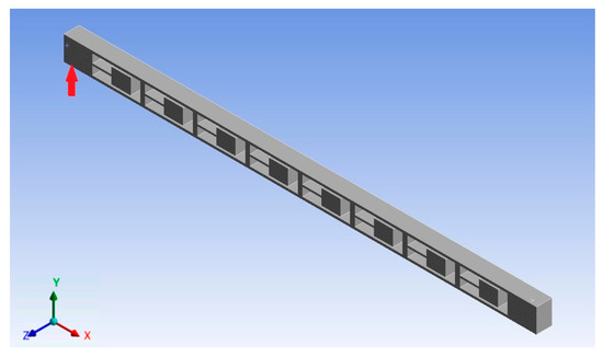 The FEM simulation is carried out using the ANSYS Workbench software. In the simulation, the two ends of the beam are free supported. Figure 15 shows the geometrical FEM simulation. In the simulation, the element size is set as default, and the average surface area is . The element type is SOILD187. The number of total elements is 1836. The order of the accuracy of the numerical scheme is The red arrow depicts the harmonic force excitation applied vertically on the beam at the point with a distance L11 = 8 mm from the left end of the host beam. The frequency range of the excitation is from 50 to 500 Hz with a step of 2 Hz. The measured point is set with a distance Lo = 8 mm from the right end of the host beam.