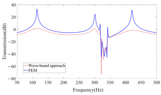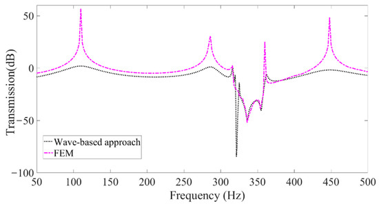 Figure 16 plots the FRFs of the LR beam suspended with resonator 1 inside, and Figure 17 shows the FRFs of the LR beam with resonator 2. As shown in Figure 16 and Figure 17, the FRF curves calculated by the proposed wave-based method and FEM have very strong consistency, thus verifying the high accuracy of the wave-based method.