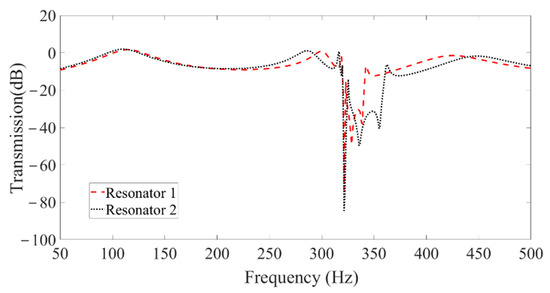 To further investigate the effect of the resonator on the band gaps of the designed LR beam, the FRF curves of the LR beam with two resonators are compared in Figure 18. As shown in Figure 18, the starting frequency of the band gaps of the LR beam with resonator 1 and 2 is the same. However, the width of the band gap of the LR beam with resonator 2 is 85.6% wider than that of the LR beam with resonator 1, thus demonstrating that increasing the resonator mass and spring stiffness can significantly improve the band gap width and increase the band gap center frequency of the LR beam.