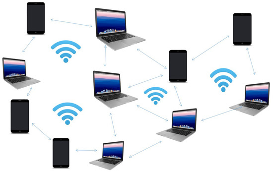The main characteristics of MANET include its fast deployable wireless network, and the fact that it is self-organizing as well as infrastructure-less. As a result, they are incredibly suitable for use in unique outdoor events, communication in areas without a crises, radio infrastructure, natural catastrophes, and military operations, among others [5,6]. Figure 1 explains the structure of MANET in various fields, where message sharing is achieved by connecting nodes to each other via wireless communication [7].