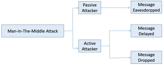 The phrase “Man-in-the-Middle” was coined in a basketball game, where a player in the middle attempts to intercept the ball as the two other players attempt to pass it [27,28]. A similar idea is used in MANET, where MITM attackers put legal nodes’ communications at risk by altering their messages. Such assaults have serious effects on the communication, particularly if the message’s content includes information about safety. In MANET, the attacker should meet the following two requirements in order to execute an MITM assault: (1) The attacker node must receive a message containing significant information; (2) The assailant should be capable of interpreting the message’s content. Figure 2 shows two ways in which MITM assaults can be initiated in the MANET.