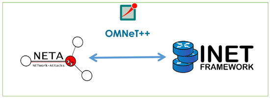 The main goal of our experiment was to investigate the performance of the MANET in the presence of harmful nodes launching MITM assaults. To simplify our simulation, this paper made use of the INET framework [29] and NETwork Attacks (NETA) [30], as depicted in Figure 4.