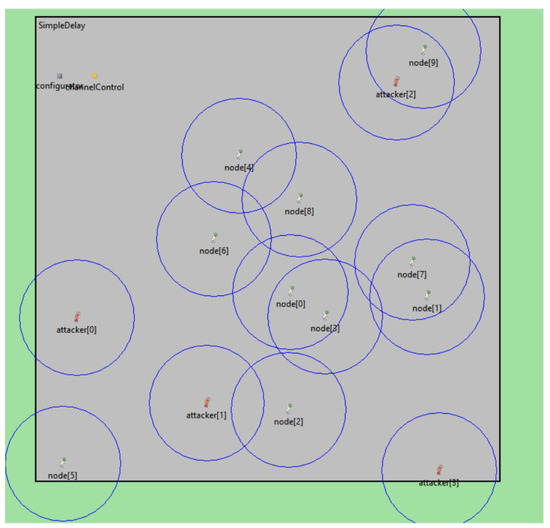 To estimate the performance of MITM assaults in MANET, this paper made use of the default simulation in OMNeT++, as depicted in Figure 5. We introduced 100 nodes into the system; the message was shared by nodes. We then injected 1, 3, 5, and 7 harmful nodes into the system to investigate the influence of attackers’ strategies, where the assailant either dropped or delayed the exchanged data. Subsequently, we selected a single-source node (e.g., Node[0]) to broadcast the UDP packets and a single-destination node (e.g., Node[20]) to receive them. Note that the source node broadcast the packets to all nodes within its coverage area, while the destination address was unicast. Table 1 describes many of the simulation-related parameters.