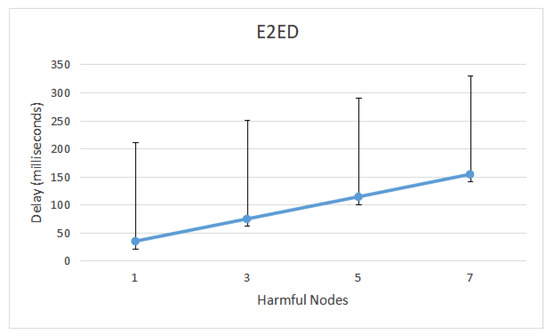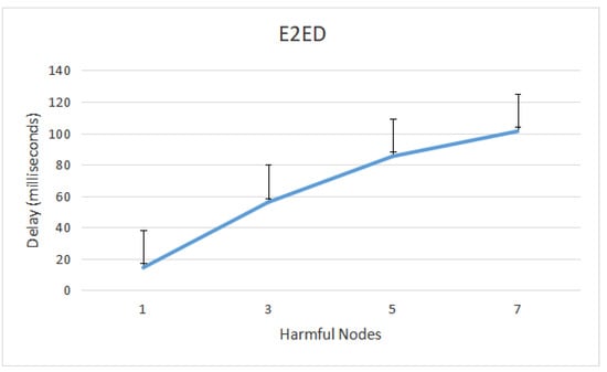 Figure 6 depicts E2ED in the presence of MITM, which caused message delays of 2 ms. It is clear that adding harmful nodes that delay valid communications within the network causes the E2ED to rise. Nevertheless, an MITM assailant with message-delaying capabilities prevent the legal nodes from receiving the messages on time. Ideally, the legal nodes should receive such legal communications with the least amount of delay. Additionally, Figure 6 shows that E2ED grows as assailants are dispersed around the network.