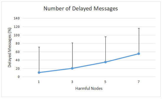Next, Figure 7 shows the number of delayed messages produced by the harmful nodes. It is evident that when harmful nodes proliferate in the network, the number of delayed messages rises. The delayed messages increase to 55.02% when seven assailants are introduced into the network.