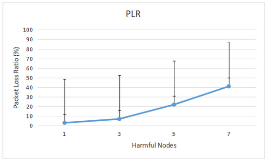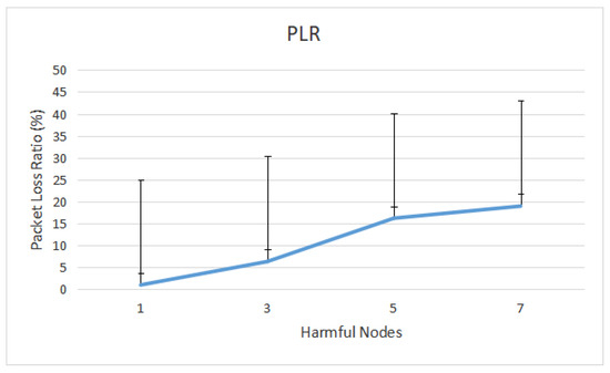 Figure 8 shows the Packet Loss Ratio (PLR) in the presence of harmful nodes. It demonstrates that PLR rises as the number of harmful nodes in the network rises. For example, when the network was flooded with seven harmful nodes, about 55.11% more packets were lost in the presence of attackers. Based on our experiment, this is because the destination that discarded the packets due to the excessive delay was in the presence of harmful nodes.