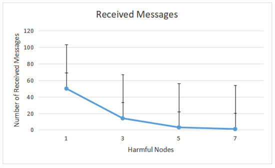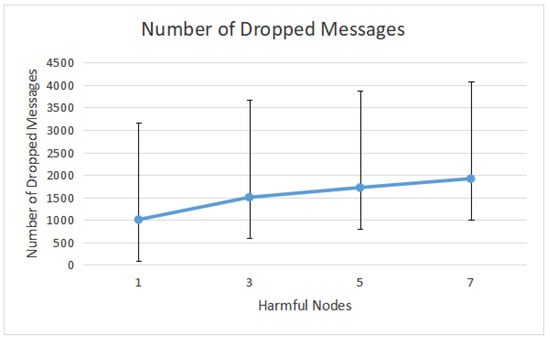 Next, Figure 10 illustrates the number of messages dropped by harmful nodes and suggests that a high number of messages are discarded when the proportion of harmful nodes in the network increases. For instance, with five attackers in the network, the simulation dropped 1721 messages.