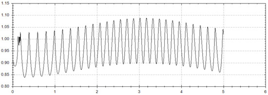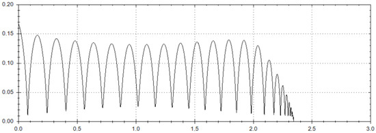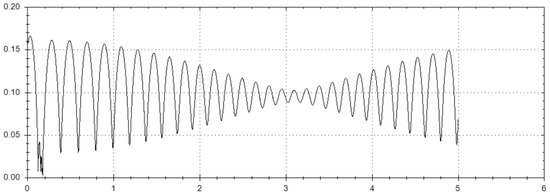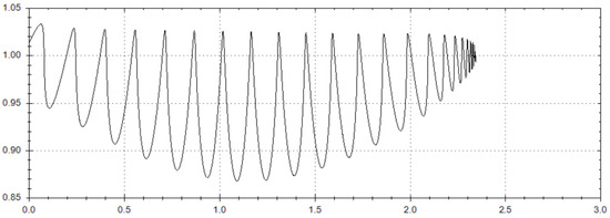 It is of keen interest to consider the case of two primaries for the system “Ceres (dwarf planet, large asteroid)—Sun” where eccentricity is chosen to be e = 0.0785, in the series of numerical solutions illuminated by Figure 1, Figure 2, Figure 3, Figure 4, Figure 5, Figure 6, Figure 7 and Figure 8. We obtain the numerical solutions by the Runge–Kutta fourth-order method with step 0.001 starting for the case of Ceres (Figure 1, Figure 2, Figure 3 and Figure 4) with the initial conditions chosen as:
