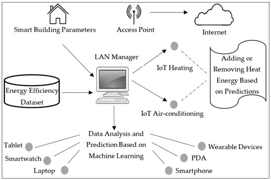 To have a better understanding of the proposed model, an example architecture is shown in Figure 2. In this model, by connecting the IoT devices and communication modules inside a smart building, the extracted knowledge from data can be delivered to the cloud through the Wi-Fi module to generate notifications and maybe alarms for smart devices (especially air-conditioning systems and IoT heating) and also for occupants (by e-mail and SMS) through different IoT devices such as a smartwatch, smartphone, laptops, PDAs, and so on. Here, symmetrical connections are assumed. After the prediction of heating load and cooling load by an intelligence model, the energy-consumption estimation is returned to the server node to notify the IoT devices, e.g., IoT air conditioning and IoT heating, and then take the necessary actions for balancing energy consumption inside the building.