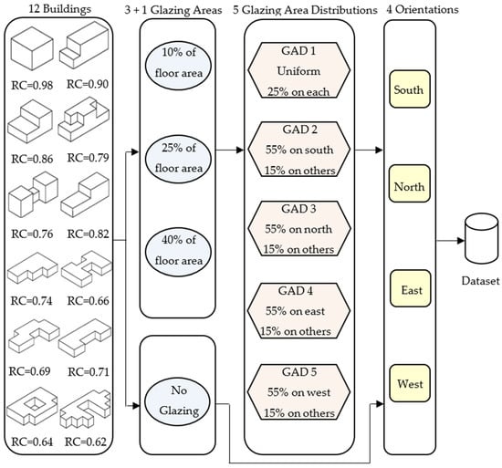 Figure 3 illustrates the general structure of the dataset, which varies in size and has four glazing regions with five distribution scenarios and four orientations. Note that the orientation consists of the north, east, south, and west. Each building form is composed of 18 elements (elementary cubes). The buildings were constructed with the most prevalent, newest, and similar materials, as well as the lowest U-value: floors (0.860 W/m2K; walls (1.780 W/m2K), windows (2.260 W/m2K), and roofs (0.500 W/m2K). The buildings are used for sedentary purposes (70 W) and are residential with a maximum of seven persons. The interior design has the following properties: 60% moistness, 0.6 clothing, 300 Lux illumination intensity, and 0.30 m/s airspeed. While the infiltration rate is 0.5 for air change rate with a wind sensitivity of 0.25 air changes/h, internal gains were set at latent (2 W/m2) and sensible gain (5). Thermal characteristics were defined by a thermostat between 19 and 24 °C, a mixed mode with a 95% efficiency, 10–20 h of operation on weekends, and 15–20 h on weekdays.