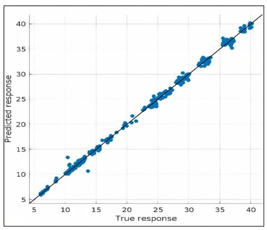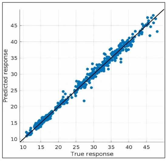 The “true response” versus “predicted response” graphs are presented in four experiments in Figure 5, Figure 6, Figure 7 and Figure 8 for heating load and cooling load prediction. A perfect regression model has a true response equal to the predicted response; hence, all points lie on a diagonal line. The vertical distance of any point from the line indicates the error of prediction for this point. In this study, the predictions were scattered no farther from the line. Therefore, it can be concluded that the models have small errors in all the experiments.