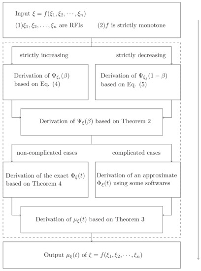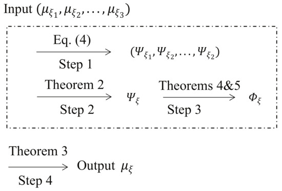 Clearly, from Theorem 5, the two distributions (credibility and inverse credibility distribution) of functions of ξ 1 , ξ 2 , , ξ n are in a one-to-one relationship. Theorems 3–5 provide an idea for the acquisition of the expression of the membership function μ ξ of functions of regular L R fuzzy intervals, which is depicted in Figure 4.