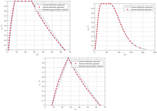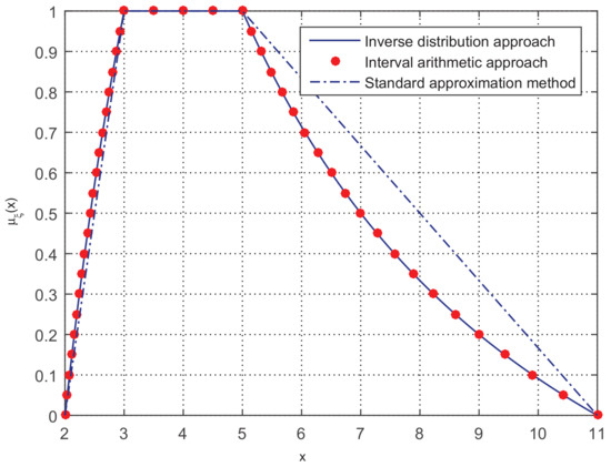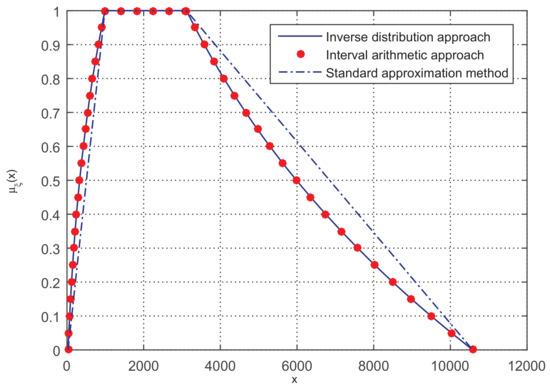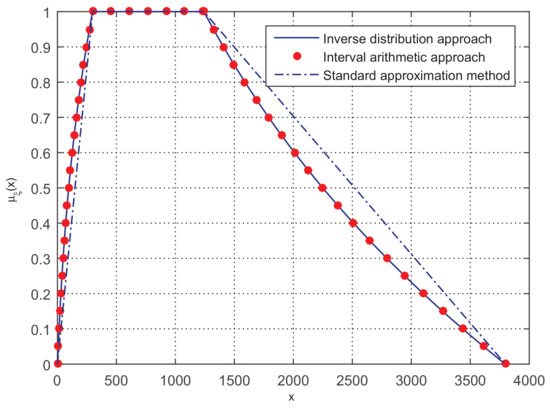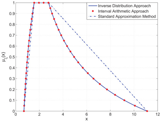 Similarly, Figure 9 represents the membership functions μ of the three approaches. The membership function of the standard approximation method has the worst performance in terms of accuracy and sometimes may have an extremely large error to the exact values. Even though the credibility distribution Φ is approximated by the “polyfit” function in MATLAB, the accuracy of the membership function from our approach can still compete with that obtained by the interval arithmetic approach.