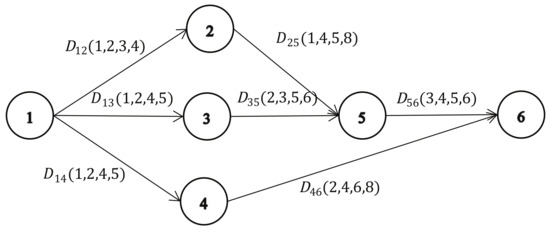 Consider a construction project with six nodes and seven activities (see Figure 11), in which the duration time D i j of each activity is symmetric TFN. From Equation (7), the completion time can be calculated by