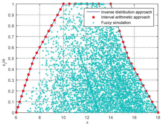 The results of the three approaches are all illustrated in Figure 12, in which the symbols “−”, “•”, and “+” demonstrate the membership function obtained by the inverse credibility distribution approach, the interval arithmetic approach, and the fuzzy simulation [18], respectively.