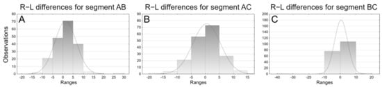 Distributions of relative differences between the right- and left-hand sides (R−L) of distinct segments. All measurements are given in mm. (A) Distribution for segment AB (antegonial notch maximum length), (B) segment AC (posterior) and (C) segment BC (anterior).
