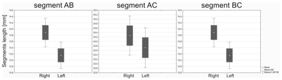 A statistically significant difference occurred only in the case of the anterior segment (the length of segment BC). In the case of the remaining measurements describing the posterior notch segment (segment AC) or antegonial notch length (segment AB) there were no statistically significant differences on the right- and left-hand sides (Table 3, Figure 3). Therefore, segment BC shows directional asymmetry, whereas other segments—fluctuating one.