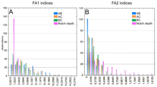 FA1 and FA2 indices (according to the Palmer classification []) show absolute rather than relative aspects of fluctuating asymmetry. Table 5 and Figure 5 show distribution of both indices calculated for each segment and area under the notch.