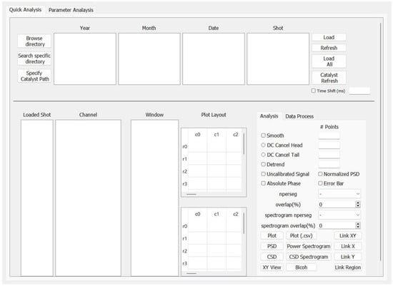 This code uses the Graphical User Interface (GUI) feature in the Python language, specifically for the STOR-M tokamak experiments where the probe data are recorded and stored in National Instruments (NI) digital modules plugged into a “PXI” crate and directly into the PSI slots in the computers. There are around 120 channels in total. LabView software is used to manage all hardware and to transfer onboard data from the digitizers to the computers and save them in the data files on the hard drives of the computers after each shot. In the experimental settings, the duty cycle time period between two discharges can be set to 4–10 min depending on the particular experiments, whereas the time to transfer and save data is completed within a few seconds. It is imperative to quickly visualize and analyze the experimental data after every recorded STOR-M discharge for complex experiments such as GAM detection to determine whether satisfactory data have been obtained or the configuration of the diagnostics setup needs to be modified. The present development of the code with interactive data analysis tools meets such requirements. In this section, the logical frame of the application is discussed. The resulting GUI window is presented in Figure 1. The flow of the works of this application is shown in Figure 2a.
