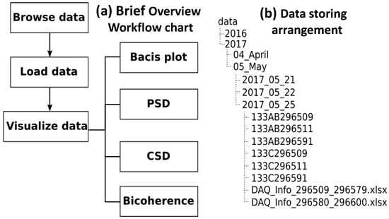 It describes how the programs run when the large amount of diagnostics data related to the experiment are stored. periodically after each STOR-M discharge in the pre-specified file in directories. Therefore, each step of the operations and their interconnections from , the next level of analytical operations, including basic plots, “Power Spectral Density”, “Cross Spectral Density”, and “Bi-coherence”, are controlled by dedicated background programs, which were solely developed for this purpose. Other available applications that were used in a logical manner are the graphical interface through the  package, a wrapper package for a GUI tool kit  [], the plotting and visualization of data through  [], a python toolkit for interactive data visualization, and the package  for spectral analysis. Figure 2b represent the sequence of the data arrangement consecutively.