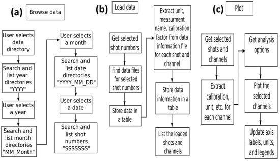 The code starts to load the experimental data in the GUI window shown in Figure 1 through the navigation to the proper directory where the experimental data of interest are stored. This process is performed through the logical flows of “browse data”, shown in Figure 3a. Figure 3b explains the logical flow chart of the “load data” in the GUI window through the interaction with the pilot Excel book, which is one of the key process of the code. Once the shot numbers are available, the shots of interest need to be “loaded” to the program through the GUI window. The program finds all the data files associated with the selected shot numbers. All the files of the selected shot numbers of interest are opened and stored in a table, in particular in the object pandas.DataFrame, which is called the data table, where each of the time series data is given a unique data ID. After that, the program opens the appropriate Excel book and extracts information about the data such as the unit, measurement name, and calibration factor for each data time series. The parameters related to each data ID are stored in another table, which is called the parameter table. The program completes the loading process by listing the shot numbers and measurement names or channels. After proper loading of the data files under analysis, in Figure 3c, the workflow for the basic plots and visualization and the nature of the experimental data are presented.