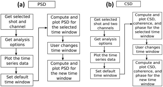To explain the GAM features, Power Spectral Density (PSD) and cross-power spectral analysis such as Cross-Spectral Density (CSD), cross-coherence, and cross-phase are essential analysis parameters adopted in the code through the GUI from the Python library. Figure 4a,b present the logic flow chart of the PSD and cross-spectral analysis.