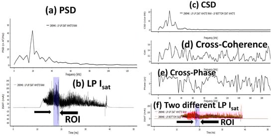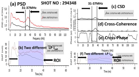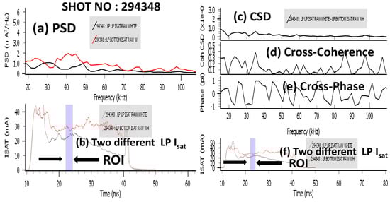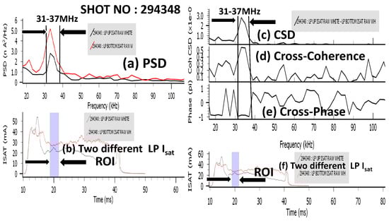 At first, the ROI was taken over the whole flat-top region of  signals, collected by the top and bottom Langmuir probes of a typical STOR-M plasma discharge with Shot Number 294,348 to obtain an overall scenario. Figure 6 clearly indicates the presence of GAM at the flat-top where the ROI time window is 22 ms. It shows the GAM-like mode having a frequency width 30–40 MHz in the plasma discharge, which is observed from the “PSD”, “CSD”, “Cross-coherence”, and “Cross-phase”, which are presented in Figure 6a,c–e, respectively. Figure 6b,f present similar  signals collected from the “top” and “bottom” Langmuir probes.