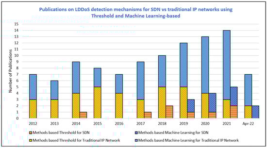 This section describes the methodology we used to conduct our survey. The search results show the interest of researchers in developing methods for detecting LDDoS attacks. We also found a large difference in the publications on LDDoS attack detection methods for traditional IP networks compared to LDDoS attack detection methods for SDN, as shown in the diagram in Figure 1.