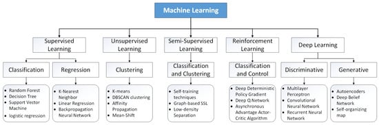 In this section, we first introduce machine learning; then, we shed the light on different machine learning techniques. Machine learning is the field in computer science that focuses on providing computers with the ability to solve problems through learning, such as in humans [26]. There are some variations in defining the types of machine learning algorithms. Still, in general, they can be categorized by their purpose into supervised, unsupervised, semi-supervised, reinforcement, and deep learning, as discussed and presented in [27,28,29]. Based on [27,28,29], machine learning techniques with multiple algorithms that fall under these types can be summarized as in Figure 2.