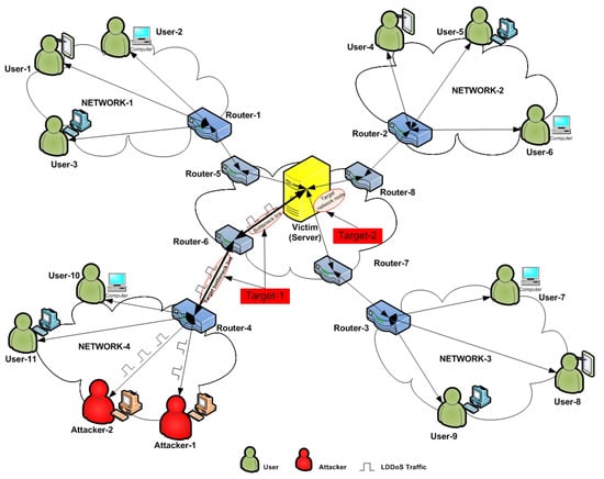 Figure 4 illustrates the concept of LDDoS attack targeting two network components: a network link (Target 1) and a node (Target 2). Target 1 is the link between router 4 and router 6, as well as between router 6 and the server. Target 2 is the server itself. Servers are considered the most frequently attacked devices, as they are considered the data repository needed by the users. As shown in the figure, two attackers (Attacker 1 and Attacker 2) launch LDDoS attacks into the network [74]. The traffic of LDDoS attack generated is indicated by the burst of rectangular pulses. The pulses describe a period of packet transmission in short duration and are repeated at a given frequency. The square pulse amplitude and length define the attack’s energy. In other words, the LDDoS attack traffic is averaged across time in the square pulse [75].
