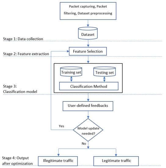 One of the most common security threats is the distributed denial-of-service (DDoS) attack that has plagued the Internet for more than 20 years, and it is becoming even more aggressive with the development of the Internet of Things (IoT) [8,9,10]. DDoS attacks have evolved, progressing from basic to high-rate to sensible low-rate traffic [11]. A new security threat known as low-rate DDoS (LDDoS) has emerged as a result of this timely transformation of DDoS attacks [12]. LDDoS attacks can take a variety of forms, such as denying service to servers by sending a very low-rate request to disrupt application services. Attackers may also use tools such as SlowDroid [13] to launch low-rate attacks on smartphones with limited processing power and exploit weaknesses in the application layer using protocols such as Slow Next [14].