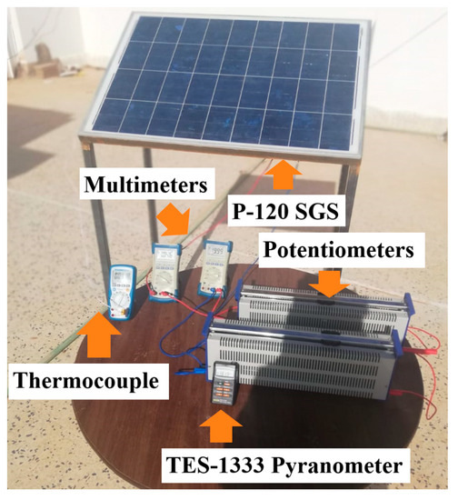 Figure 3 exhibits the experimental setup of P-120 SGS, which was held in September 2021 above the building of laboratories in Taif University. Firstly, in this Section, P-120 module is implemented at RAC where G and are measured via pyranometer and thermometer, respectively. Secondly, P-120 module is implemented at various irradiances and temperatures to exhibit BMOA functioning at various conditions and the results are recorded in Section 6. Potentiometers are employed to load this SGS progressively up to 8 A. Digital multimeters are employed to measure and . Twenty-one points of measurements of V/I are recorded. The equipment class and errors are revealed in Table 3.