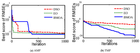 Comparisons between BMOA, EO, and DSO dependent on the results show that the obtained RMSEs by BMOA own the lowest value, namely 9.22045 × 10−2 using AMP, which is less than that which resulted from other optimizers in the literature by 11.18% to 20.73%, and when TMP is used, the resultant RMSEs are 3.55604 × 10−18, which is less than that which resulted from other optimizers in the literature by 99.99%. The advantage of utilizing BMOA for identifying the nine UPs of the 3-DM of SGSs is clear, since the minimum decrease in RMSEs is 11.18% using AMP and 99.99% using TMP, as revealed in Figure 5 and Table 6.