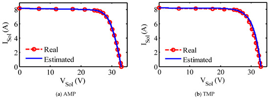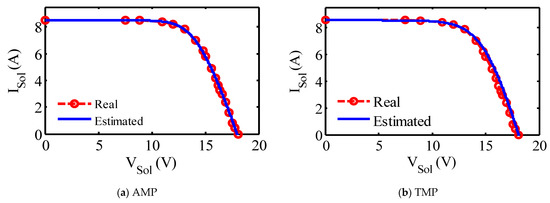 The yielded results for the I/V plot of SGS at RAC that are extracted by BMOA using AMP and the measured values are displayed in Figure 6a and Figure 7a, for KC200GT and P-120 modules, correspondingly. Closeness amongst the experienced electric currents and calculated electric currents by BMOA affirms the precision of the estimated UPs of the 3-DM of the SGSs. While similar results are extracted by BMOA using TMP (Figure 6b and Figure 7b), there is less closeness despite the RMSEs being smaller, since RMSEs are computed only at TMP, which prove that TMP does not suffice to characterize SGS, as mentioned in Section 1.